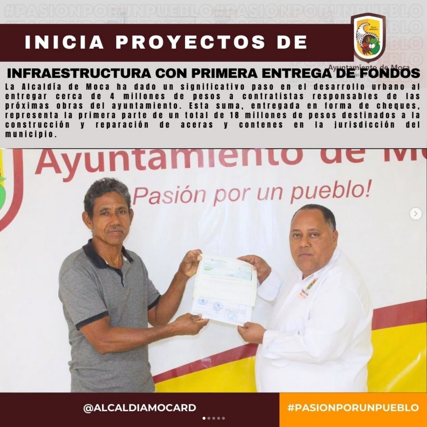 La Alcaldía de Moca ha dado un significativo paso en el desarrollo urbano al entregar cerca de 4 millones de pesos a contratistas responsables de las próximas obras del ayuntamiento. Esta suma, entregada en forma de cheques, representa la primera parte de un total de 18 millones de pesos destinados a la construcción y reparación de aceras y contenes en la jurisdicción del municipio.