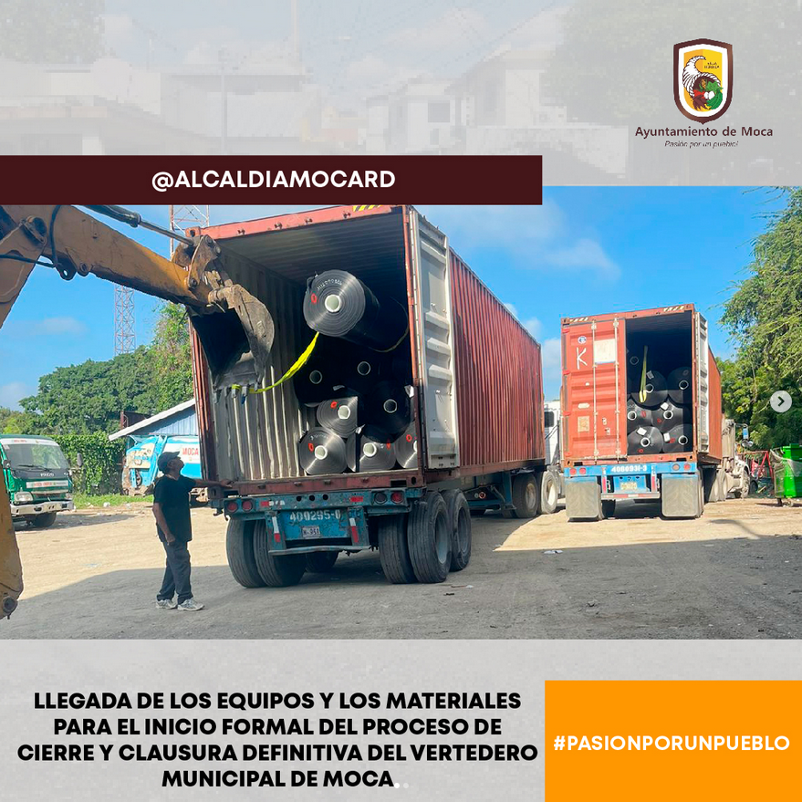 Es la llegada de los equipos y los materiales para el inicio formal del proceso de cierre y clausura definitiva del vertedero municipal de Moca, los cuales ya están depositados en el campamento del ayuntamiento; desde este lunes se inician y avanzan en los trabajos técnicos de ingeniería sanitaria que terminarán con mas de cincuenta años de demandas del pueblo mocano para eliminación de dicho foco de contaminación ambiental y de riesgo a la salud humana de los mocanos. El presidente Luis Abinader, en coordinación con el alcalde Guarocuya Cabral, y a través de Do Sostenible y de los fondos de Fideicomiso para la gestión de los RSU ha dispuesto de más de doscientos cincuenta millones de pesos.
