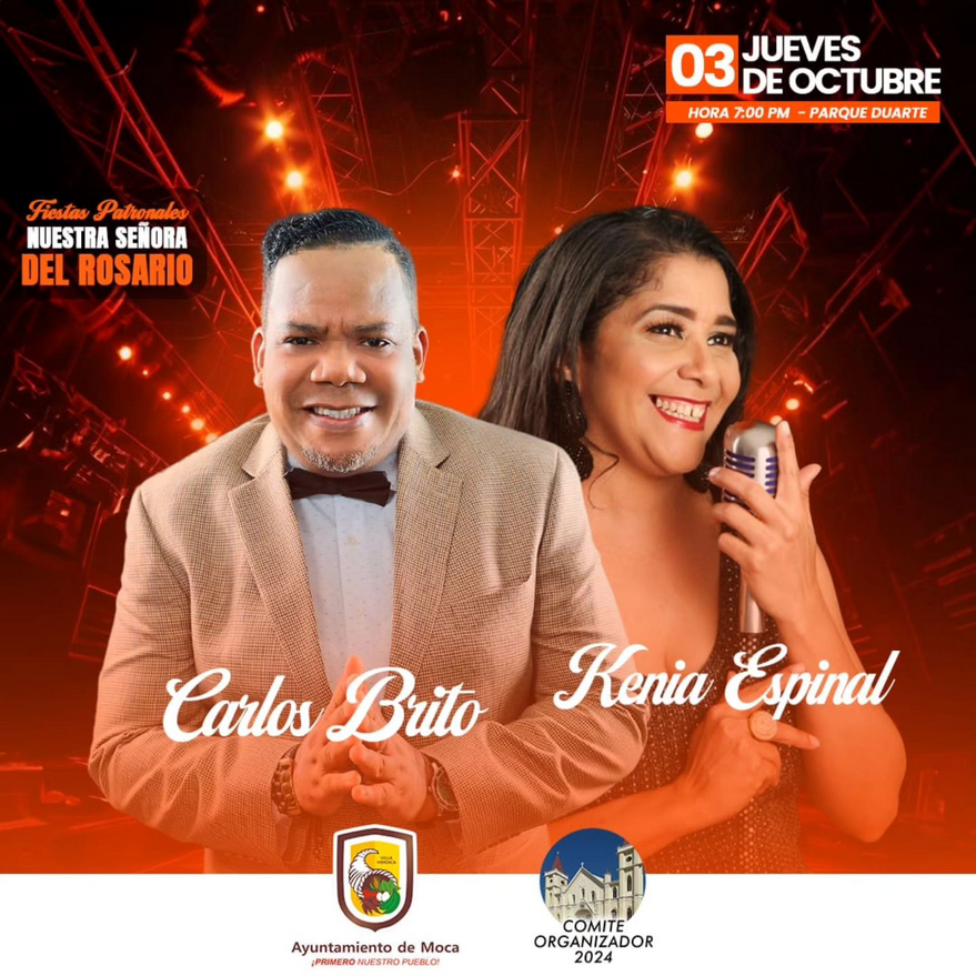 ¡Prepárate para una noche inolvidable en las Patronales Nuestras Señoras del Rosario 2024! 🎶🎤 Nos complace anunciar que Carlos Brito y Kenia Espinal estarán en el escenario con presentaciones espectaculares. 🙌 No te pierdas esta celebración llena de tradición, música y alegría. 🎇🎵