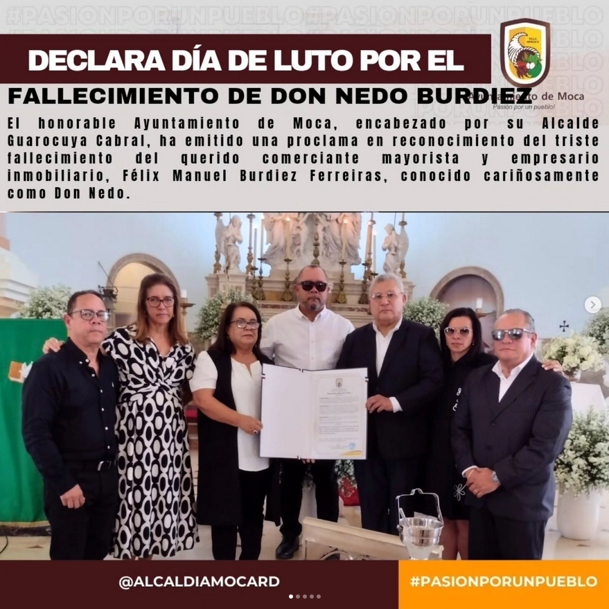 Por esta razón, el sábado 16 de noviembre de 2024 ha sido declarado como Día de Luto y Tristeza Municipal en Moca, como un homenaje a la vida y los valiosos aportes de Don Nedo Burdiez a la comunidad.
