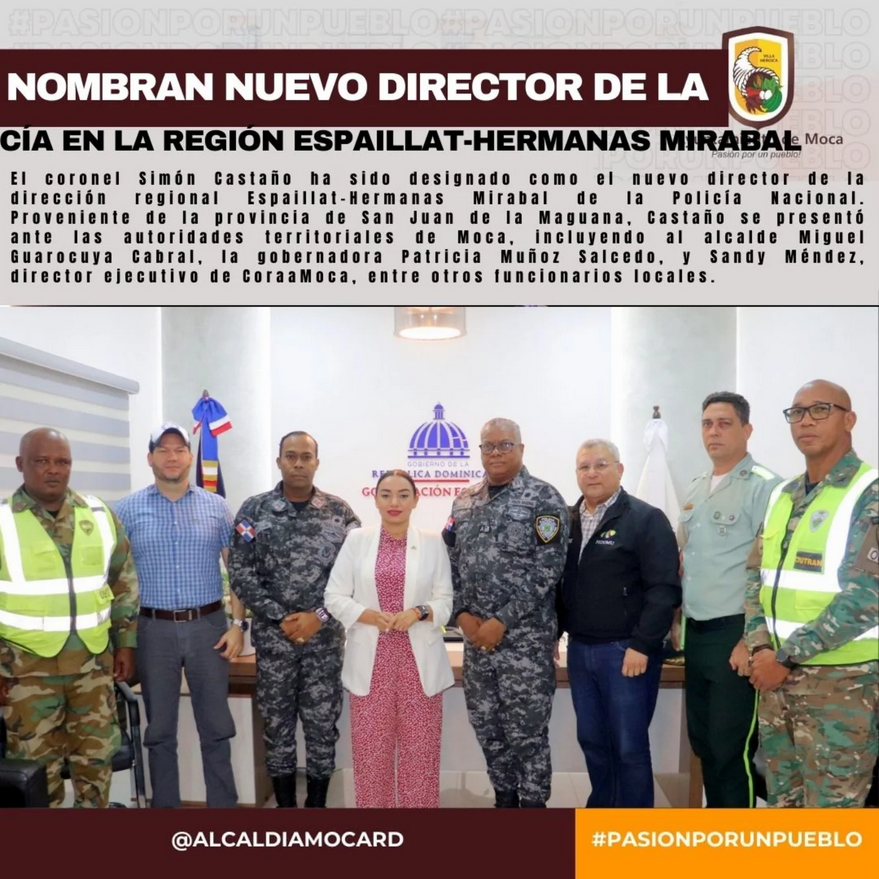 El coronel Simón Castaño ha sido designado como el nuevo director de la dirección regional Espaillat-Hermanas Mirabal de la Policía Nacional. Proveniente de la provincia de San Juan de la Maguana, Castaño se presentó ante las autoridades territoriales de Moca, incluyendo al alcalde Miguel Guarocuya Cabral, la gobernadora Patricia Muñoz Salcedo, y Sandy Méndez, director ejecutivo de CORAAMOCA, entre otros funcionarios locales.
