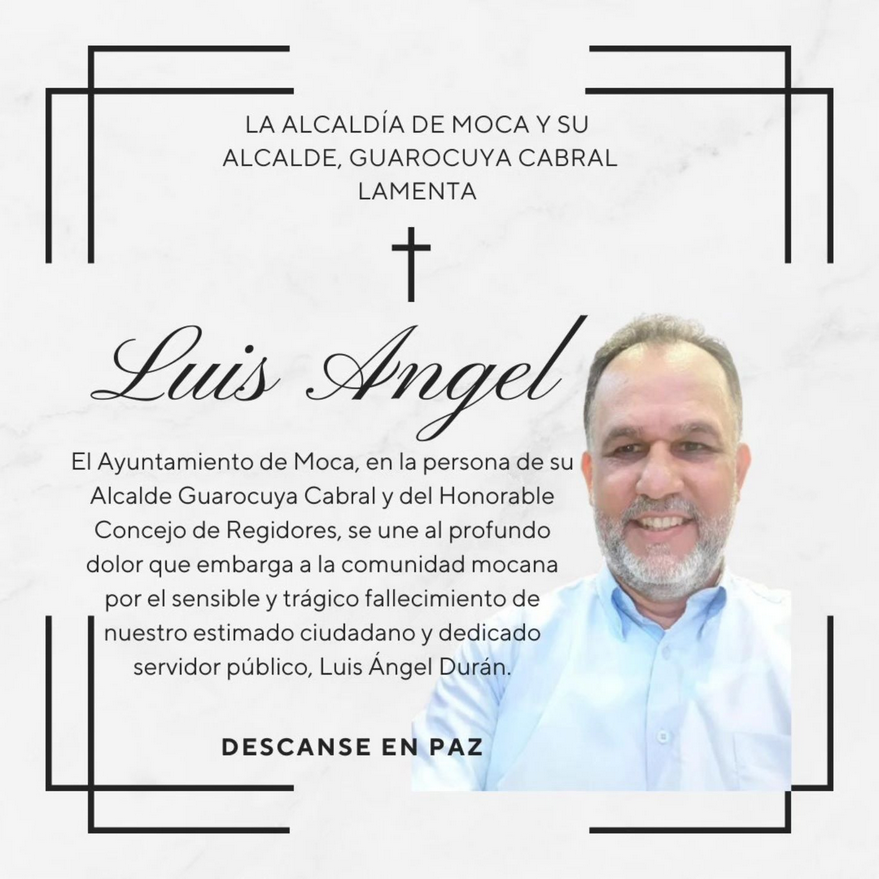 El Ayuntamiento de Moca, en la persona de su Alcalde Guarocuya Cabral y del Honorable Concejo de Regidores, se une al profundo dolor que embarga a la comunidad mocana por el sensible y trágico fallecimiento de nuestro estimado ciudadano y dedicado servidor público, Luis Ángel Durán.
