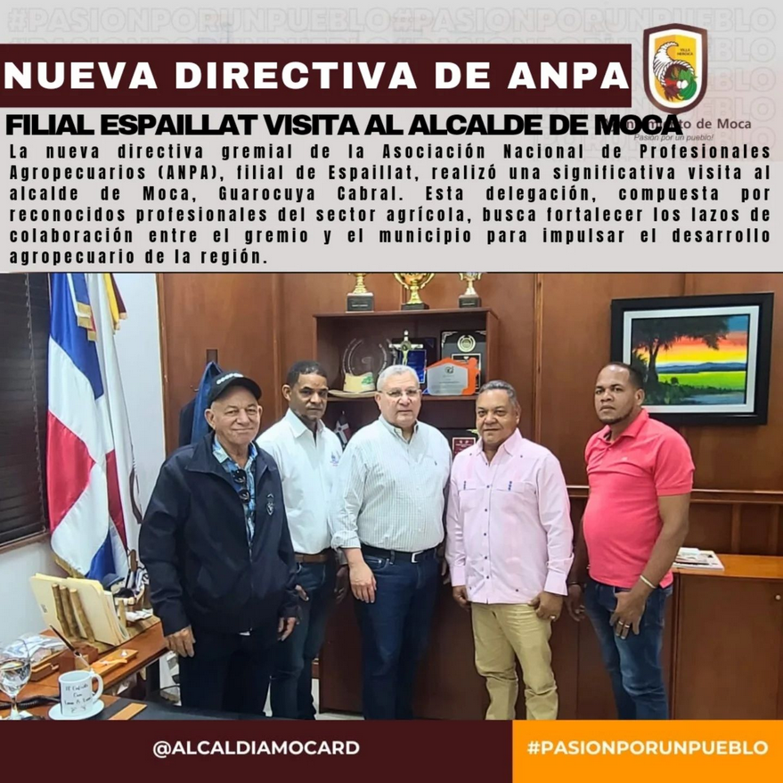 Moca, 26 Noviembre 2024. La nueva directiva gremial de la Asociación Nacional de Profesionales Agropecuarios (ANPA), filial de Espaillat, realizó una significativa visita al alcalde de Moca, Guarocuya Cabral. Esta delegación, compuesta por reconocidos profesionales del sector agrícola, busca fortalecer los lazos de colaboración entre el gremio y el municipio para impulsar el desarrollo agropecuario de la región.
