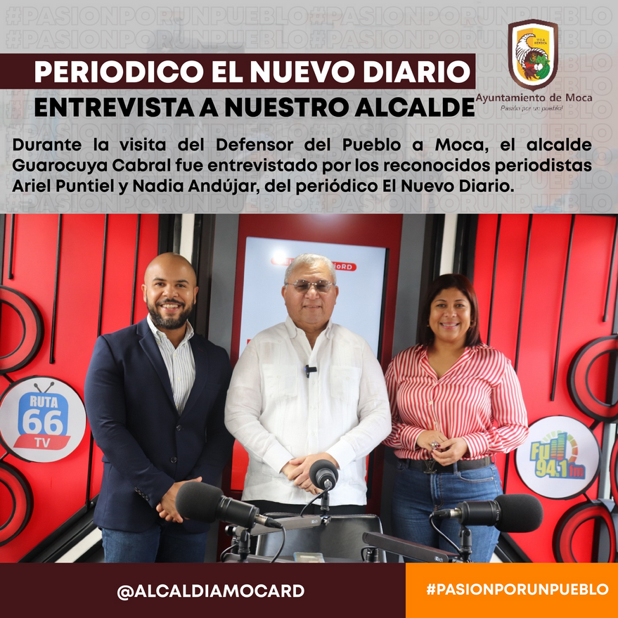 Durante la visita del Defensor del Pueblo a Moca, el alcalde Guarocuya Cabral fue entrevistado por los reconocidos periodistas Ariel Puntiel y Nadia Andújar, del periódico El Nuevo Diario. En esta entrevista, el alcalde Cabral aprovechó la oportunidad para resaltar la importancia de promover el respeto y la garantía de los derechos fundamentales y sociales en la República Dominicana, destacando el papel clave que desempeña la Defensoría del Pueblo en esta lucha. Subrayó que el trabajo de esta institución es esencial para el fortalecimiento de la democracia y el bienestar de los ciudadanos.