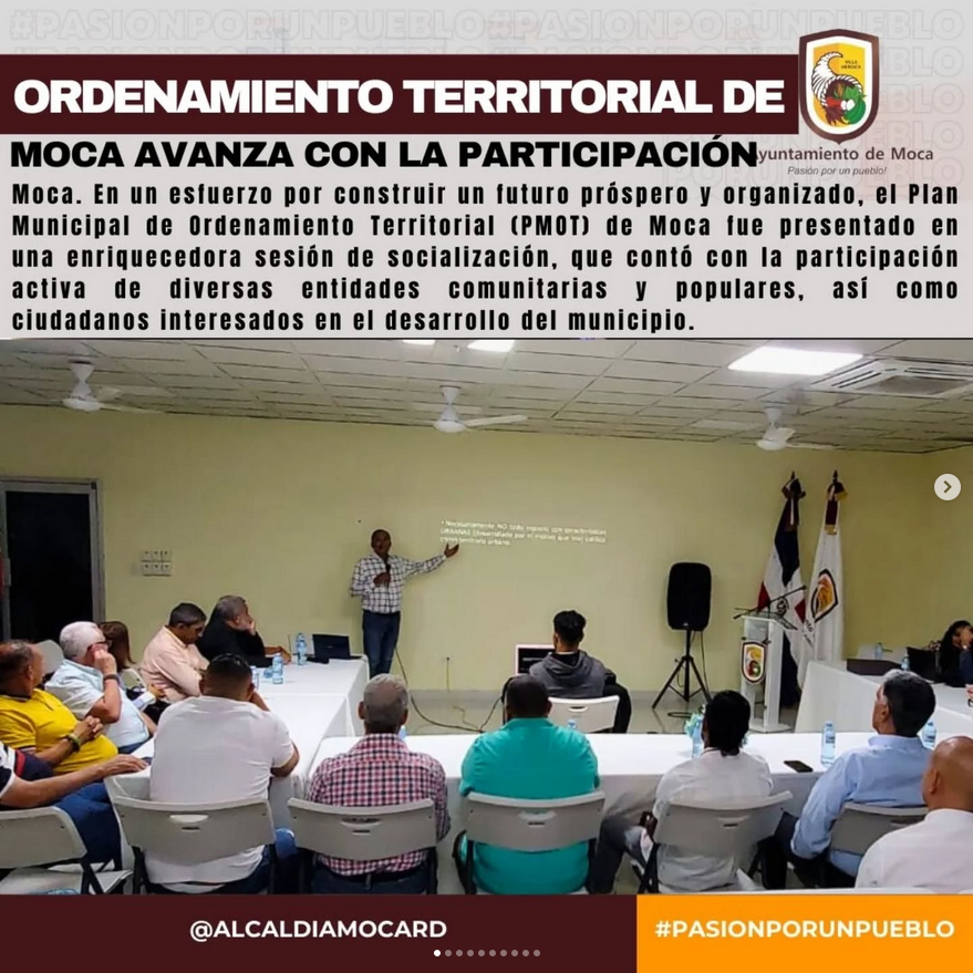 Moca,09 Diciembre2024. En un esfuerzo por construir un futuro próspero y organizado, el Plan Municipal de Ordenamiento Territorial (PMOT) de Moca fue presentado en una enriquecedora sesión de socialización, que contó con la participación activa de diversas entidades comunitarias y populares, así como ciudadanos interesados en el desarrollo del municipio. La membrecía ampliada del Consejo Municipal de Desarrollo y del Consejo Económico y Social también formó parte de este encuentro crucial para el destino de Moca.