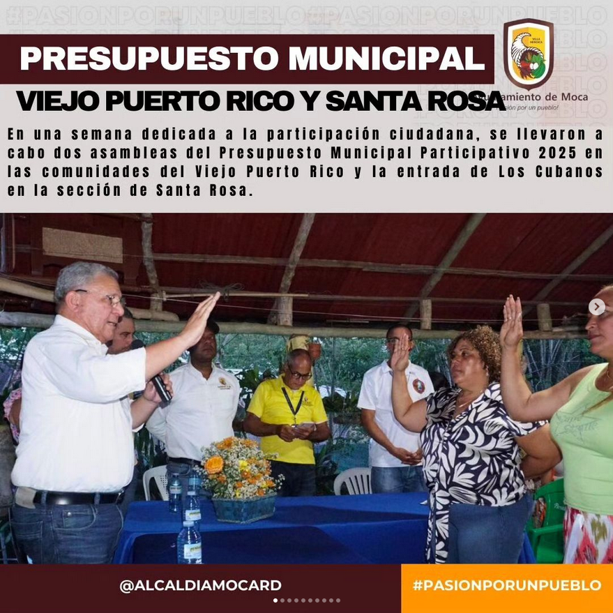 En una semana dedicada a la participación ciudadana, se llevaron a cabo dos asambleas del Presupuesto Municipal Participativo 2025 en las comunidades del Viejo Puerto Rico y la entrada de Los Cubanos en la sección de Santa Rosa. En la primera comunidad, los ciudadanos seleccionaron como prioridades el arreglo del techo de la iglesia católica y la construcción de un tramo de la verja de la cancha. Mientras tanto, en Los Cubanos, fue aprobada la construcción de aceras, contenes y el acondicionamiento del camino.