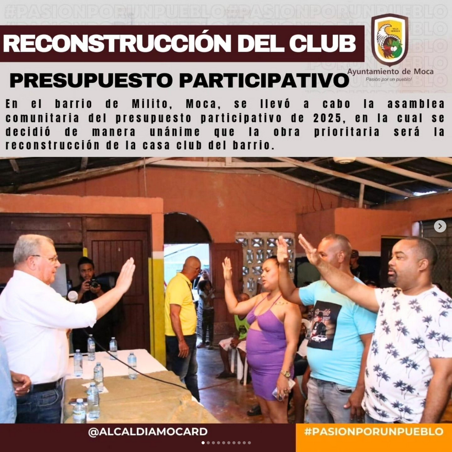 En el barrio de Milito, Moca, se llevó a cabo la asamblea comunitaria del presupuesto participativo de 2025, en la cual se decidió de manera unánime que la obra prioritaria será la reconstrucción de la casa club del barrio. Este proyecto fue seleccionado por votación de los vecinos, líderes comunitarios y el aval de las autoridades municipales, quienes señalaron la importancia de este espacio para el desarrollo social y comunitario.