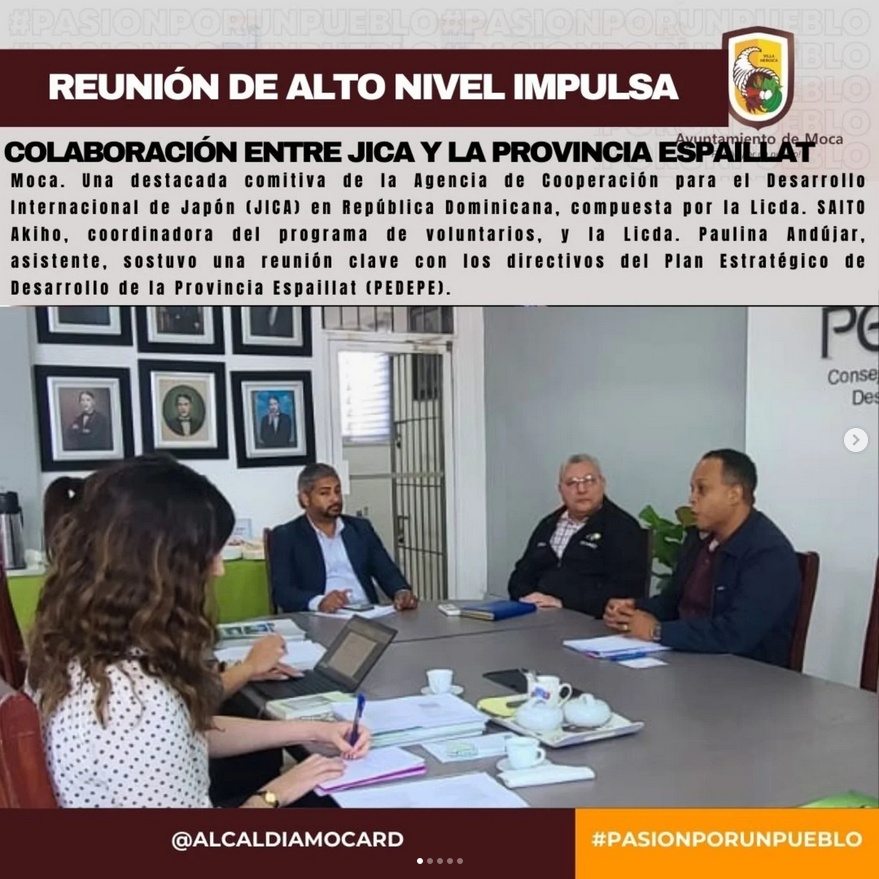 Durante la reunión, que tuvo lugar en las oficinas de PEDEPE, participaron figuras de relevancia local como el Alcalde de Moca, Miguel Guarocuya Cabral, el Lic. Santiago Álvarez, director ejecutivo de PEDEPE, y el Ing. Julio Abreu, alcalde de Cayetano Germosén. El tema central del encuentro fue el papel de los voluntarios japoneses en el impulso de un innovador programa destinado a la clasificación y valorización de residuos sólidos urbanos en su punto de origen en Moca como plan piloto.