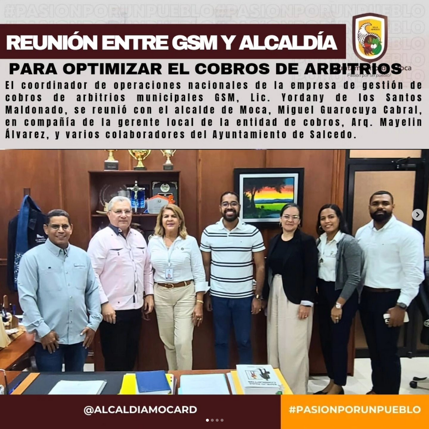 El coordinador de operaciones nacionales de la empresa de gestión de cobros de arbitrios municipales GSM, Lic. Yordany de los Santos Maldonado, se reunió con el alcalde de Moca, Miguel Guarocuya Cabral, en compañía de la gerente local de la entidad de cobros, Arq. Mayelin Álvarez, y varios colaboradores del Ayuntamiento de Salcedo, en la provincia Hermanas Mirabal.
