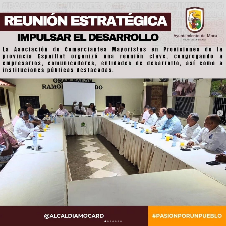 La Asociación de Comerciantes Mayoristas en Provisiones de la provincia Espaillat organizó una reunión clave, congregando a empresarios, comunicadores, entidades de desarrollo, así como a instituciones públicas destacadas, incluido el Ministerio Administrativo de la Presidencia, el Ayuntamiento de Moca y la Gobernación de Espaillat. Este encuentro tiene como objetivo lograr un consenso en torno a importantes obras y acciones que promuevan el desarrollo económico sostenible, trabajando conjuntamente con la provincia de Santiago.