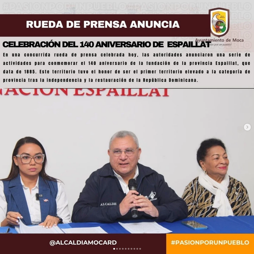 Moca, 31/01/25. En una concurrida rueda de prensa celebrada hoy, las autoridades anunciaron una serie de actividades para conmemorar el 140 aniversario de la fundación de la provincia Espaillat, que data de 1885. Este territorio tuvo el honor de ser el primer territorio elevado a la categoría de provincia tras la independencia y la restauración de la República Dominicana.