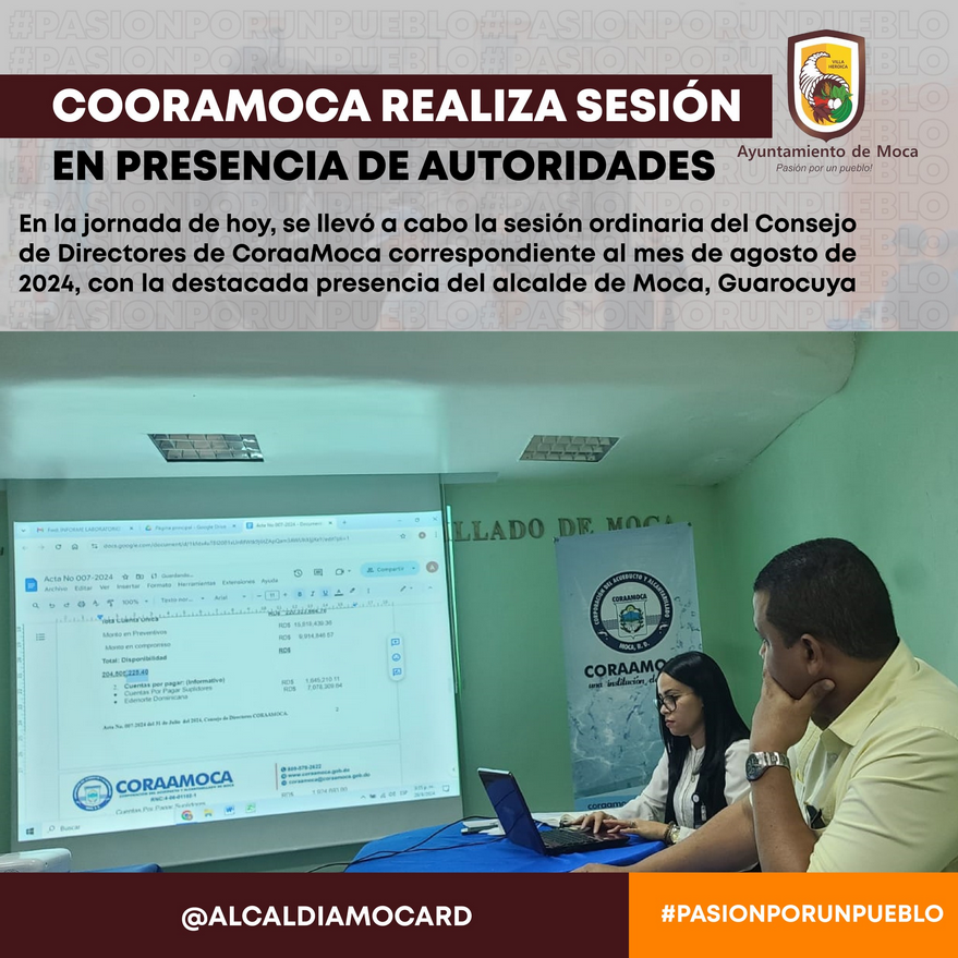 En la jornada de hoy, se llevó a cabo la sesión ordinaria del Consejo de Directores de CoraaMoca correspondiente al mes de agosto de 2024, con la destacada presencia del alcalde de Moca, Guarocuya Cabral. La reunión estuvo encabezada por el director general, Lic. Sandy Méndez, y contó con la participación del presidente del consejo, Eriberto Grullón, junto a los demás miembros del consejo directivo.