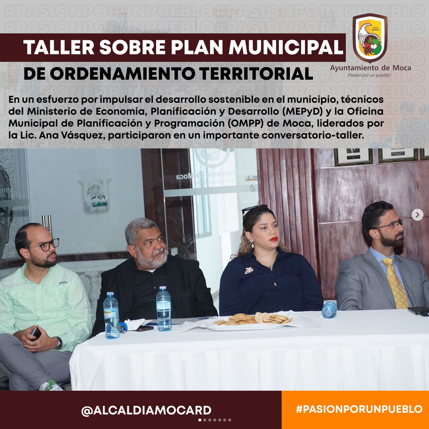 – En un esfuerzo por impulsar el desarrollo sostenible en el municipio, técnicos del Ministerio de Economía, Planificación y Desarrollo (MEPyD) y la Oficina Municipal de Planificación y Programación (OMPP) de Moca, liderados por la Lic. Ana Vásquez, participaron en un importante conversatorio-taller. Este evento contó también con la presencia de Nayeli Germoso, consultora para el Plan de Ordenamiento Territorial, su equipo de técnicos y Mariano García, junto al alcalde Guarocuya Cabral.