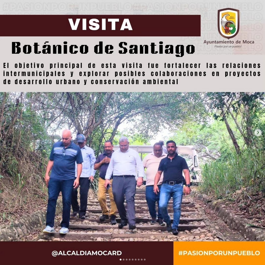 En una importante visita y reunión de trabajo, una comisión de autoridades municipales del Ayuntamiento de Moca se trasladó al Parque Botánico de Santiago de los Caballeros. La comitiva estuvo encabezada por el alcalde Guarocuya Cabral, acompañado por los ingenieros Miguel Ángel Fernández y Junior Núñez, director de la Oficina de Planeamiento Urbano y el director de Obras Públicas Municipal, respectivamente. También se unieron el Lic. Santiago Álvarez, director del Plan Estratégico de Desarrollo de Moca (PEDEPE), y el arquitecto Yky Tejada, diseñador del Parque Lineal Zoológico.