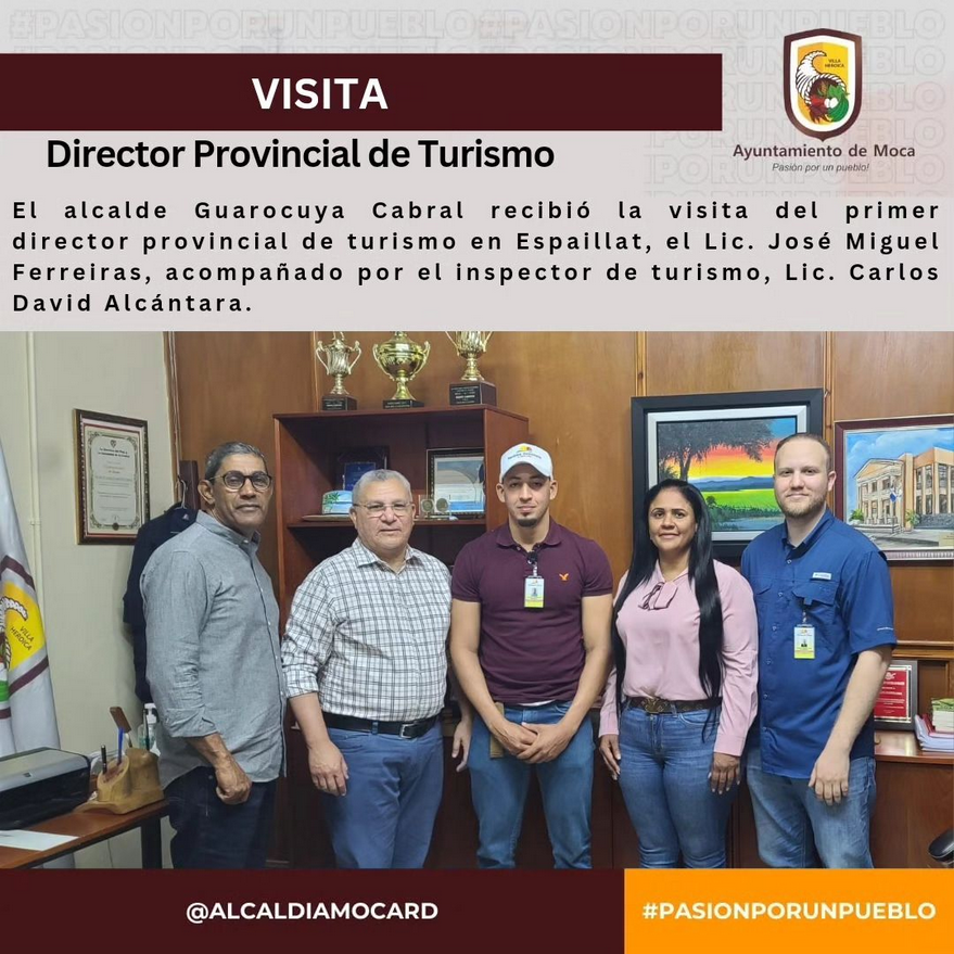 En una significativa reunión celebrada hoy en la Alcaldía de Moca, el alcalde Guarocuya Cabral recibió la visita del primer director provincial de turismo en Espaillat, el Lic. José Miguel Ferreiras, acompañado por el inspector de turismo, Lic. Carlos David Alcántara, y los regidores Serafin Arroyo, presidente del Concejo y Doris D. León.